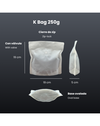 The K Bag Doypack 250g Transparent Brown coffee bags are a strong packaging solution. Made of brown plastic material, they offer durability and practicality. Their flat base ensures stability and easy storage, while the resealable zip-lock closure maintains freshness. They are ideal for coffee brands looking for a natural and minimalist look.