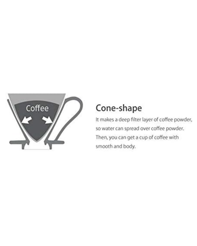 The cone shape makes a deep filter layer for ground coffee so water can spread evenly.